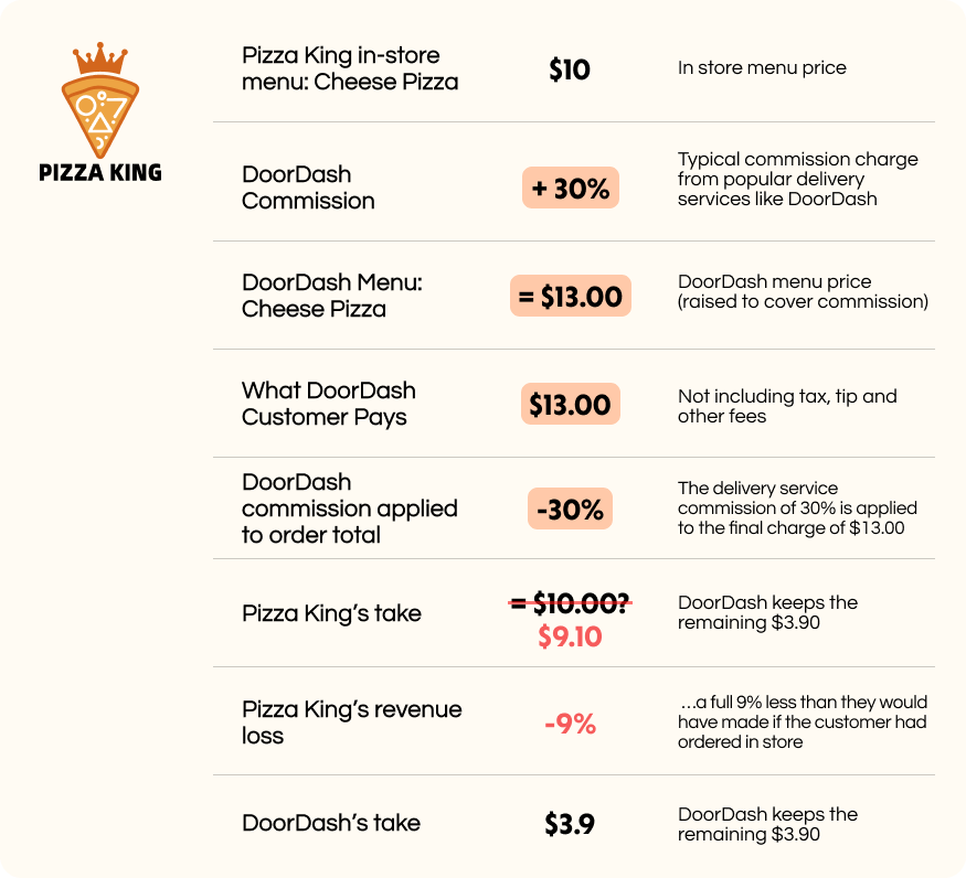 For restaurants, apps typically take around 30% commission per order. Take Pizza King as an example. The owner will typically raise their menu prices on third-party apps by 30% to cover the commissions that third-party apps charge.